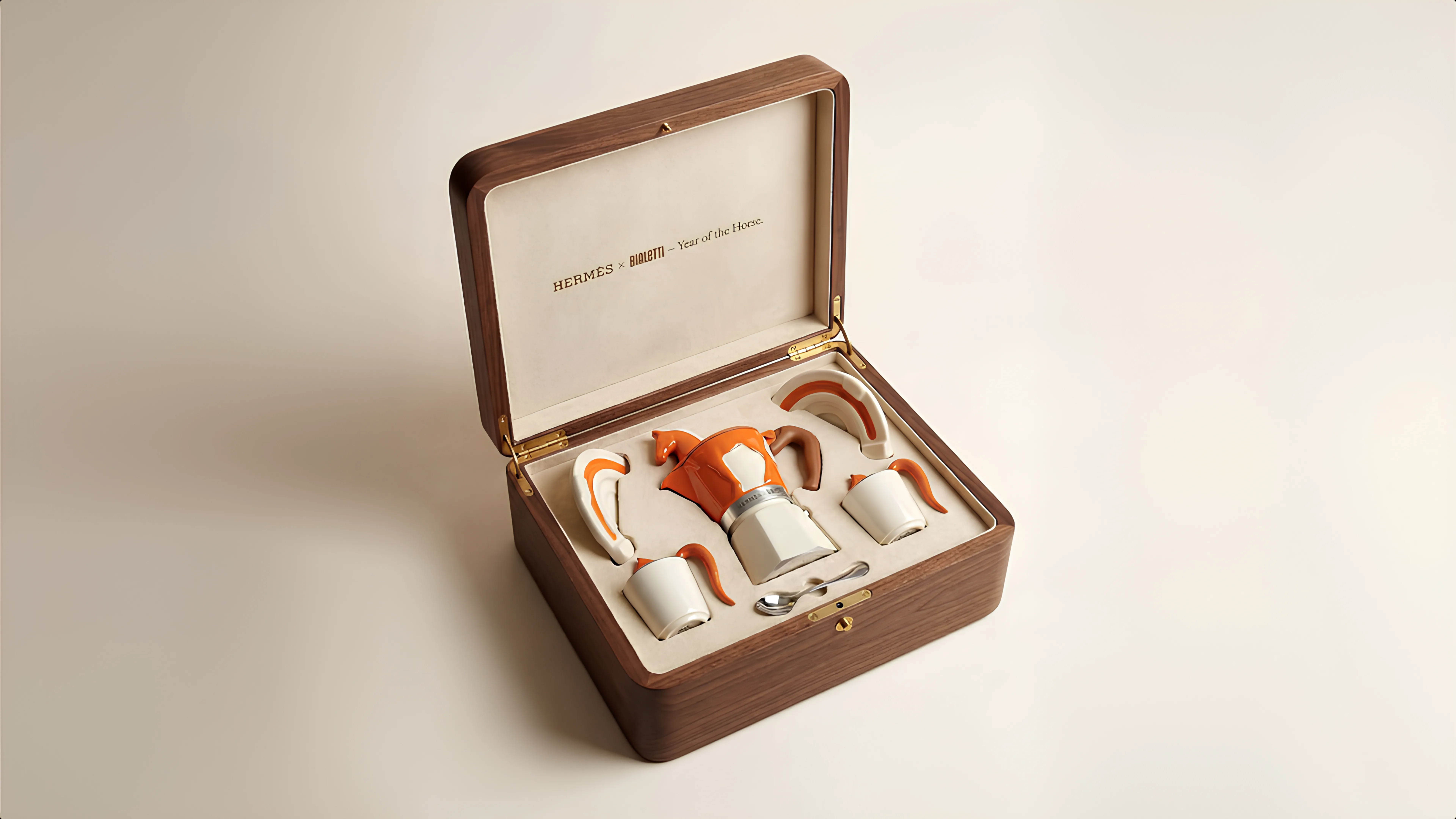 The moka pot body is imagined in a deep burgundy-orange tone, finished with a cream horse silhouette. The lid handle becomes a sculpted three-dimensional horse. The side handle shifts to a cognac brown, referencing Hermès’ leather craftsmanship.